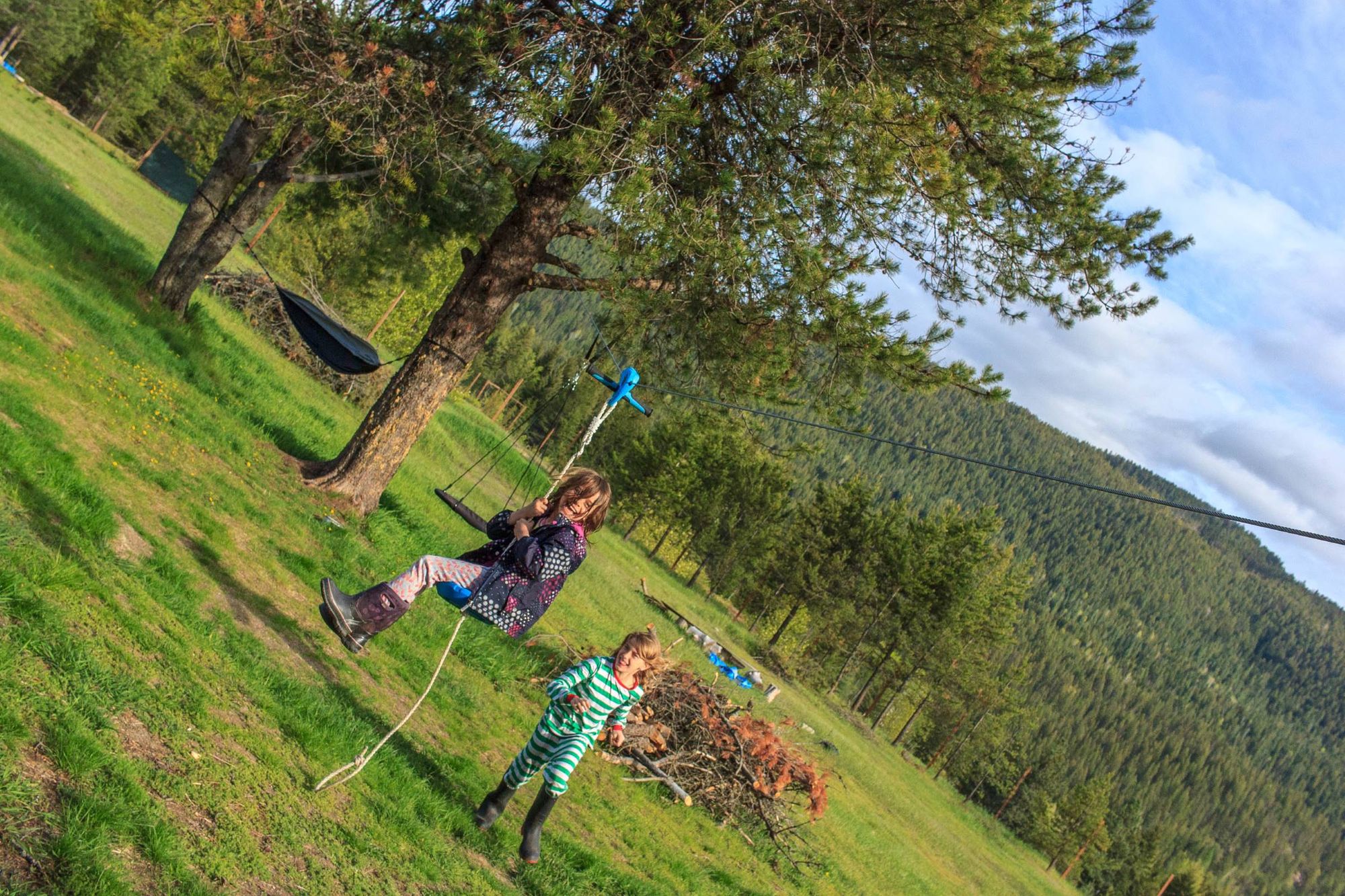 On a installé quelques jeux pour les enfants dans la cour: Balançoire, hamac et tyrolienne. Les enfants passent un peu plus de temps dehors du coup, succès ? On a fait abattre un pin mort, en arrière, tout en gardant la base du tronc pour installer le hamac et éventuellement faire une petite cabane dans l'arbre, à suivre...