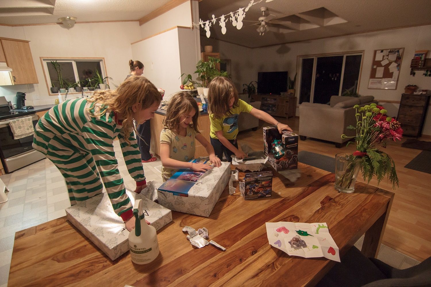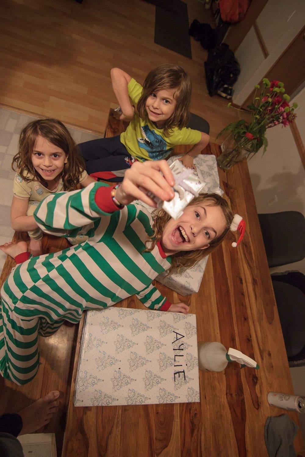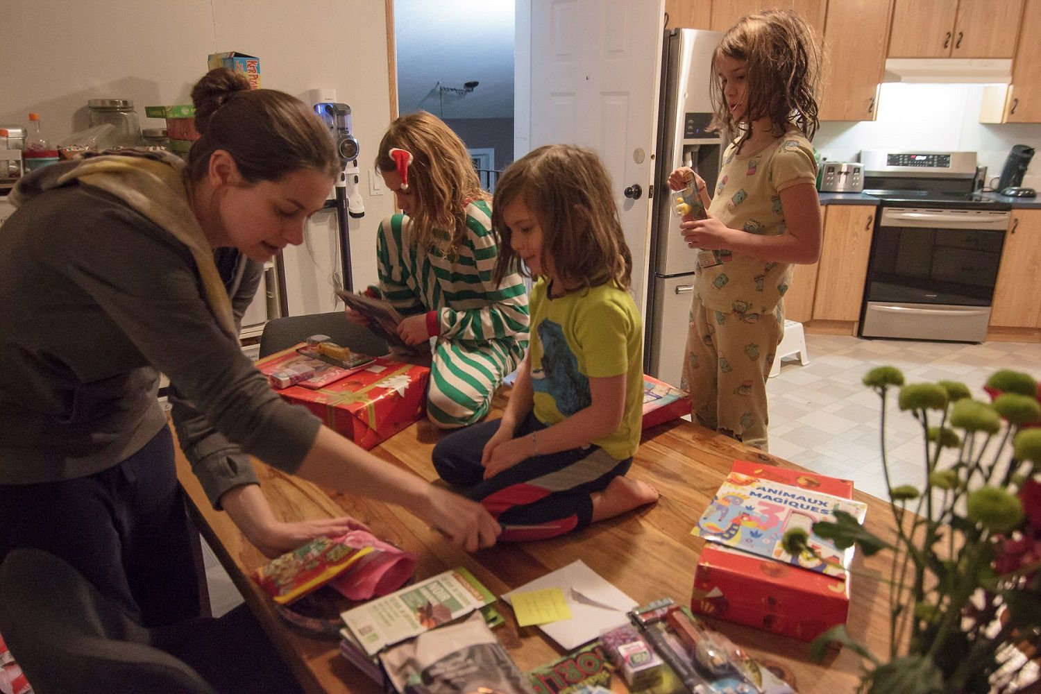Alors, pour bien comprendre, il faut savoir que cette année, on a décidé d'adopter une formule un peu différente, c'est à dire, un seul cadeau par enfant pour le 25 et le reste, ce sont des jeux de société à partager. Quand on est déménagés, on a vendu plus de la moitié de nos jeux pour ne conserver que nos préférés, question d'alléger le transport d'objets. Tous les jeux de société ont été emballés, hop! sous le sapin, ils doivent se mettre d'accord sur la boîte à ouvrir et déballer un nouveau cadeau selon le calendrier. On en profite pour passer plus de temps ensemble et essayer de réduire les conflits/frustrations, question d'améliorer la complicité de la fratrie.