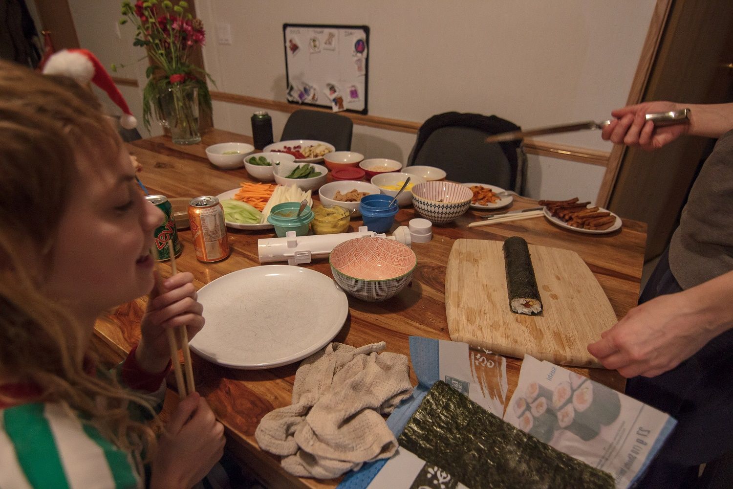 On aura passé un excellent temps des fêtes; partagé de beaux moments en famille, vu quelques amis, déneigé à souhait pour un noël extra blanc et mangé copieusement! Il faut dire qu'on a fait une liste de demande spéciales de chacun pour cette période... on aura eu au menu; des sushis, des rouleaux de printemps, des pommes de terre farcies, une tarte aux bananes, un salami au chocolat, des fauxmages et faux-foie gras, une salade de fruits, des biscuits et c'est sans compter les desserts spéciaux - des desserts glacés aux cannes de bonbons, au chocolat et en forme de sapins, miam! Alors, on ne s'est pas que bourré de sucre, on s'est aussi bourré de sommeil. Oh que oui! Grasse matinée TOUS LES JOURS, alors vers la fin des vacances on a un peu ambitionné, on se levait en moyenne vers midi hahaha. Ça faisait 10 ans que j'attendais le retour de ce moment!