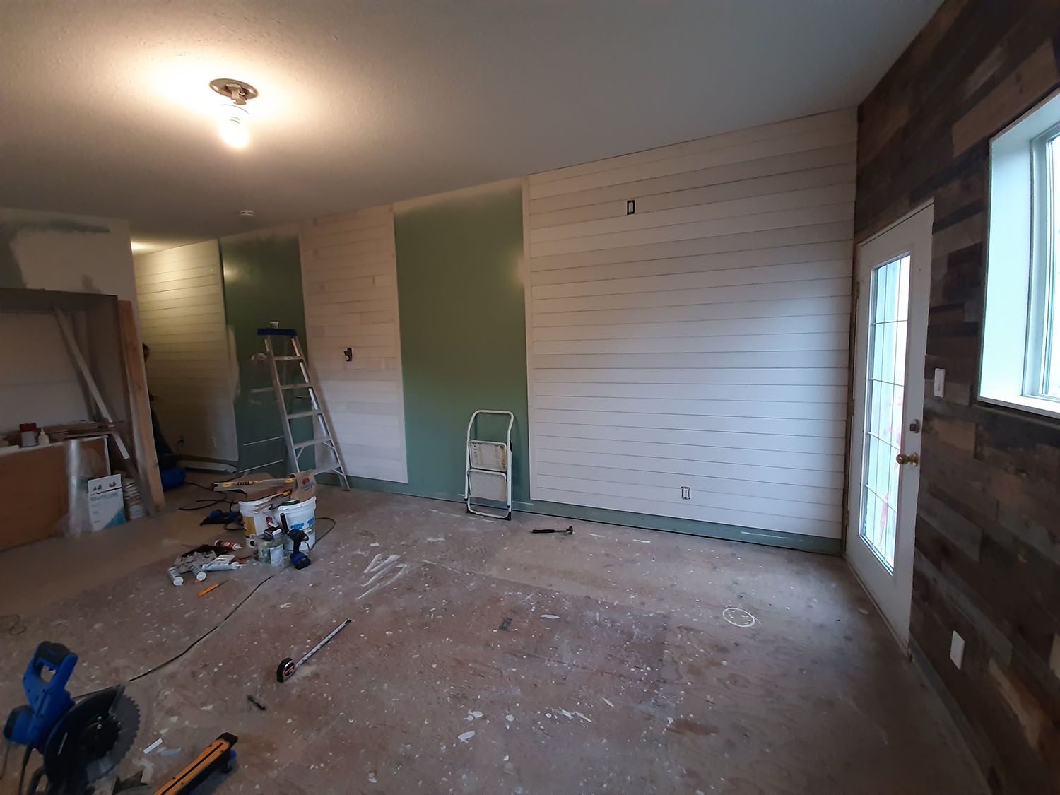 Kim a fini d'installer le shiplap, on a décidé de faire 3 sections parce que 1. nous n'avions pas assez de matériaux pour faire tout le mur et 2. on s'est dit que ça serait plus intéressant. En tout cas, j'aime beaucoup, on va peindre les sections de mur en jaune comme le mur de l'autre côté, et poncer puis peindre le shiplap en blanc. On se rapproche !