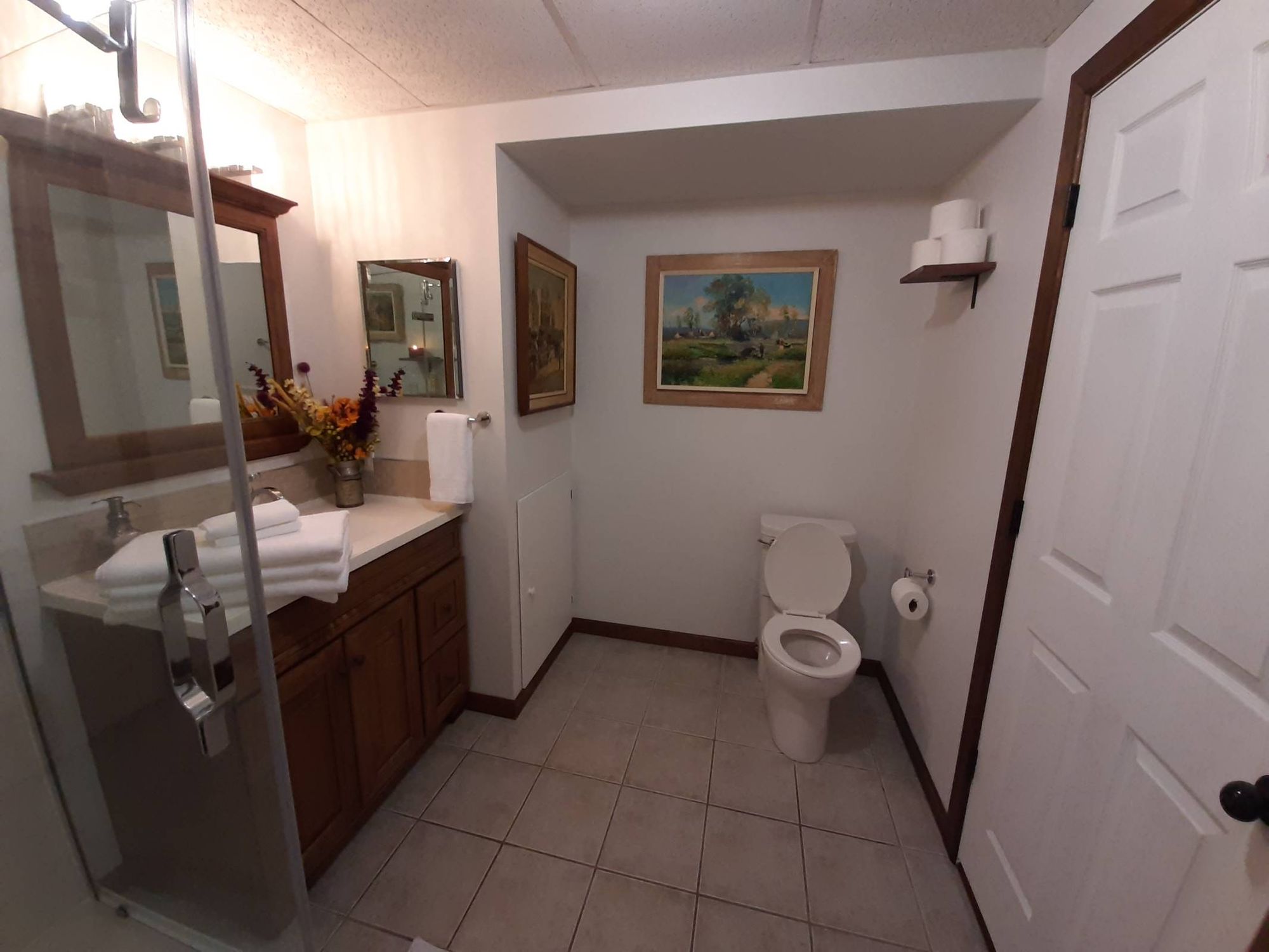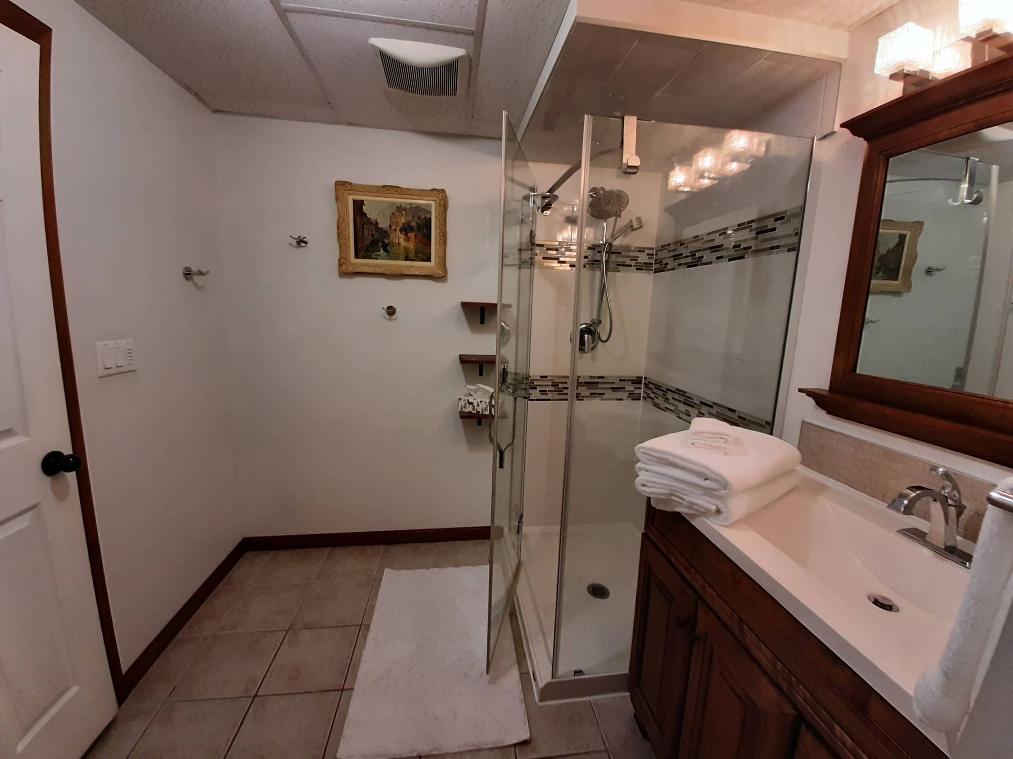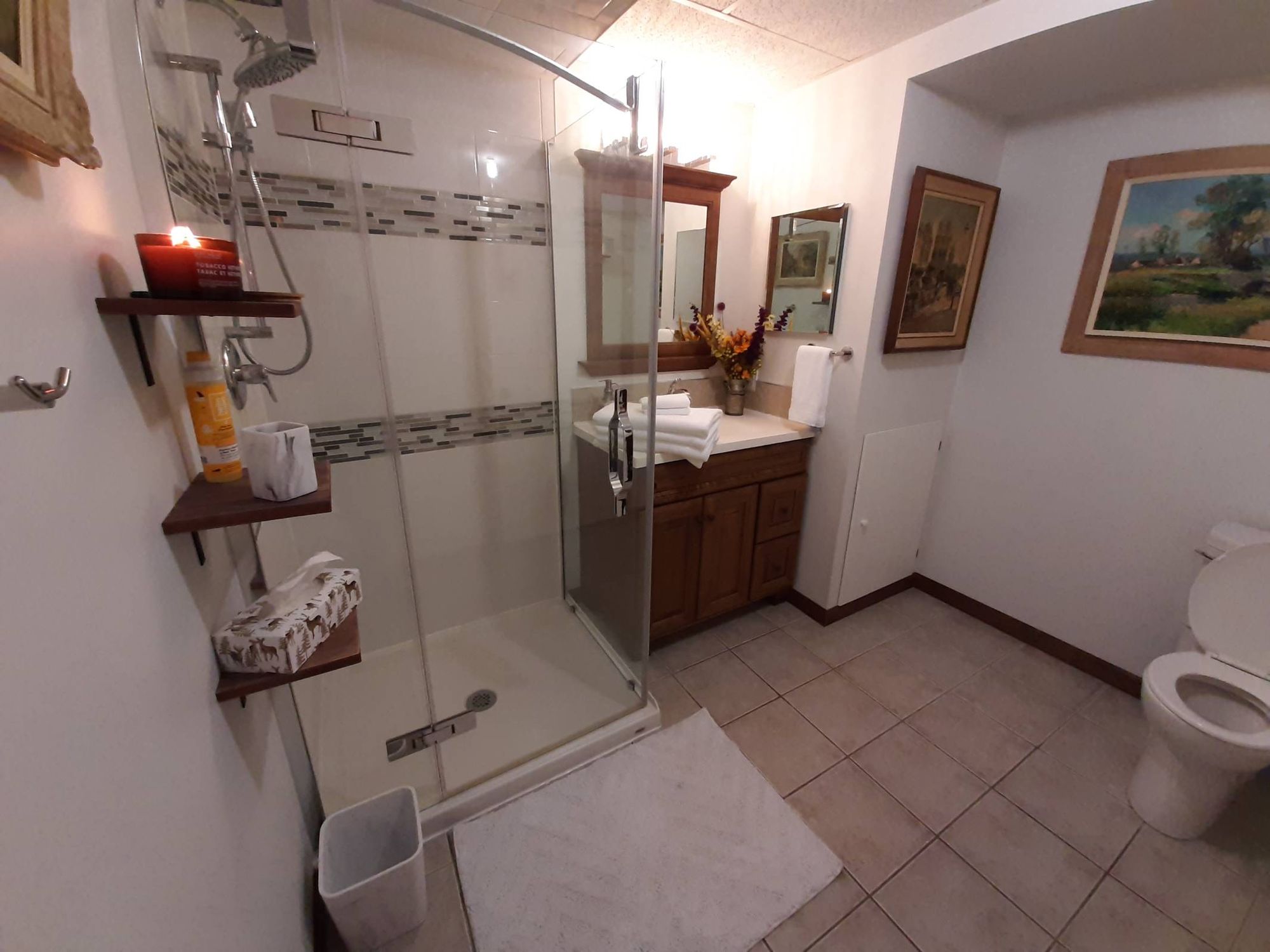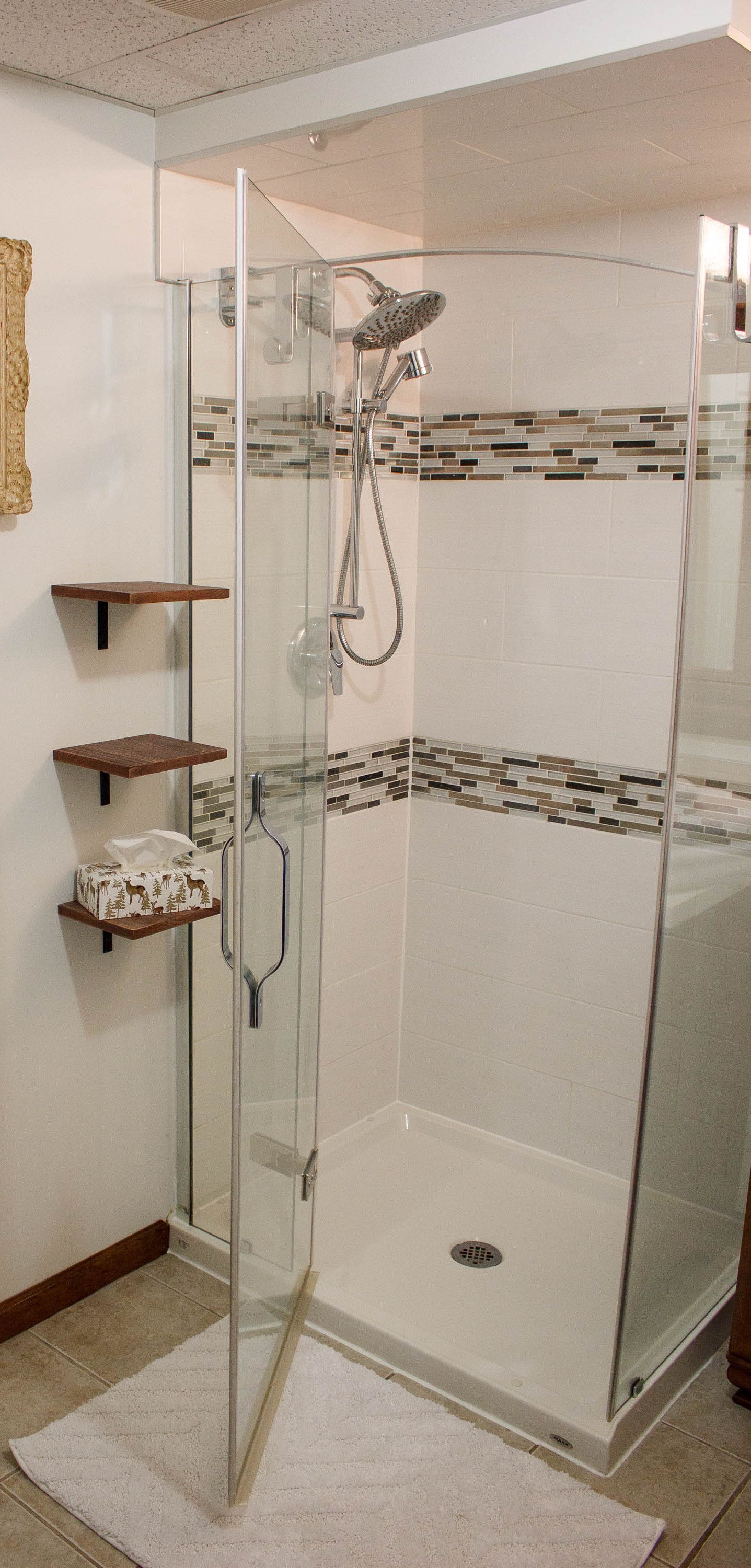 Gros nettoyage! Tout tout tout, incluant murs, plafonds, planchers et grille de ventilation (beurrk!) J'ai ajouté une petite porte de plywood pour cacher la pompe d'évacuation du sous-sol. Tous les joints de silicone refaits correctement dans la douche et un nouveau joint entre la céramique et le lavabo. Un peu de déco, quelques tablettes et hop! Prêt en quelques jours de travail.