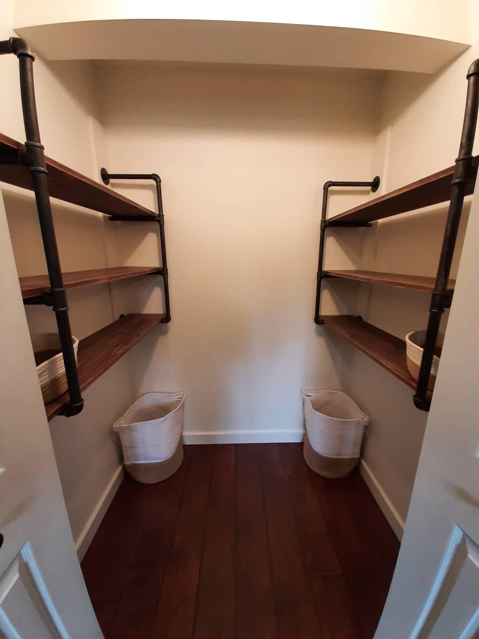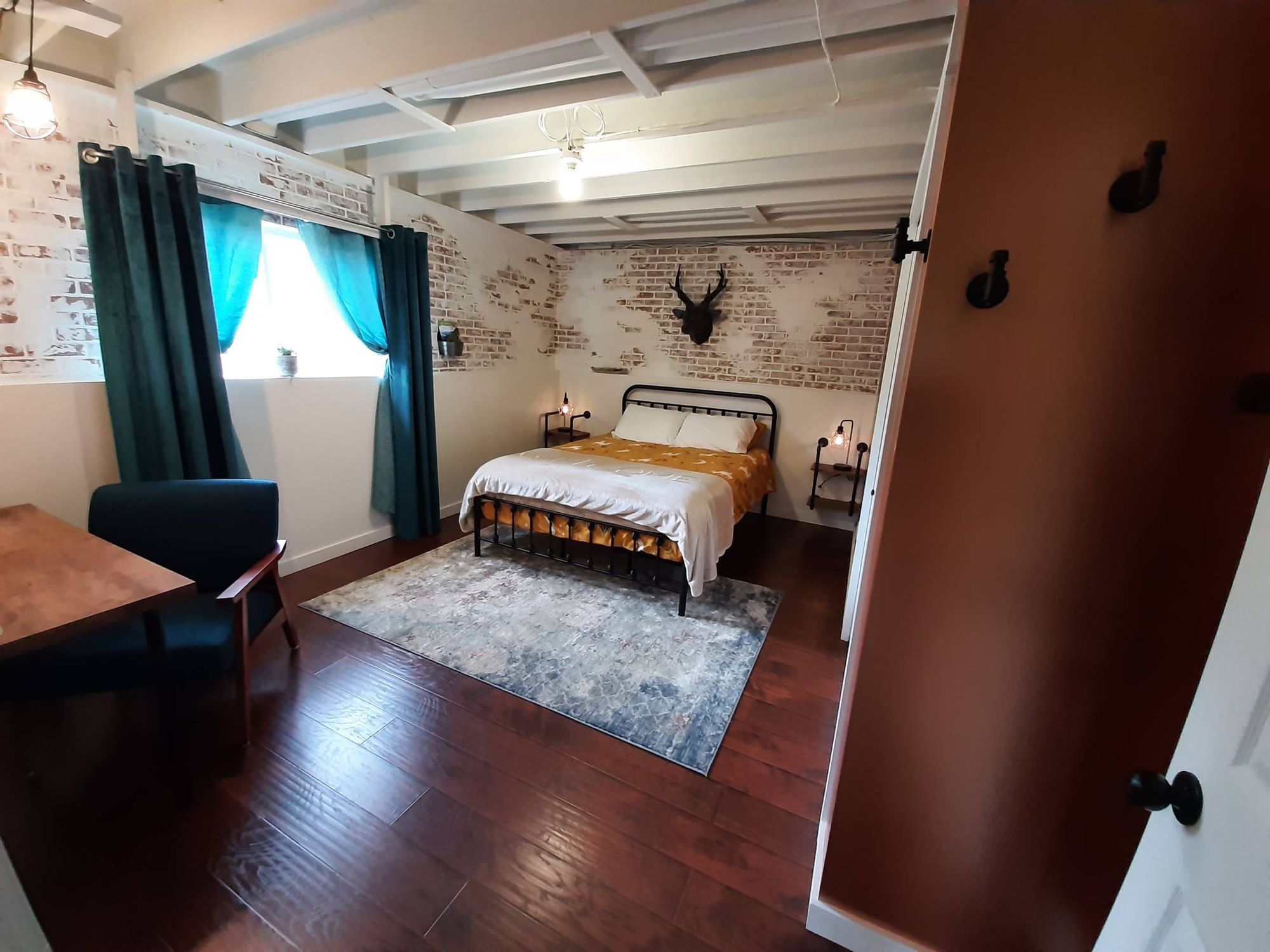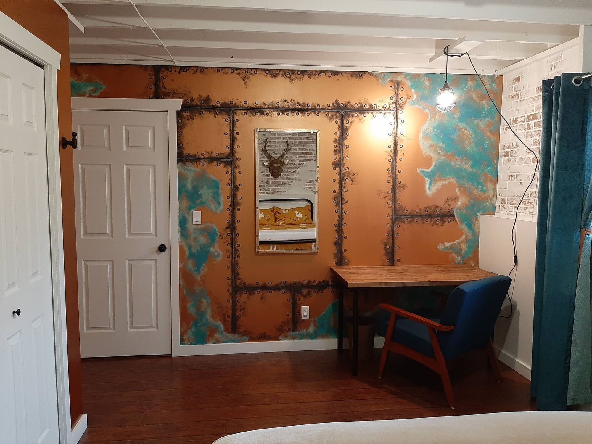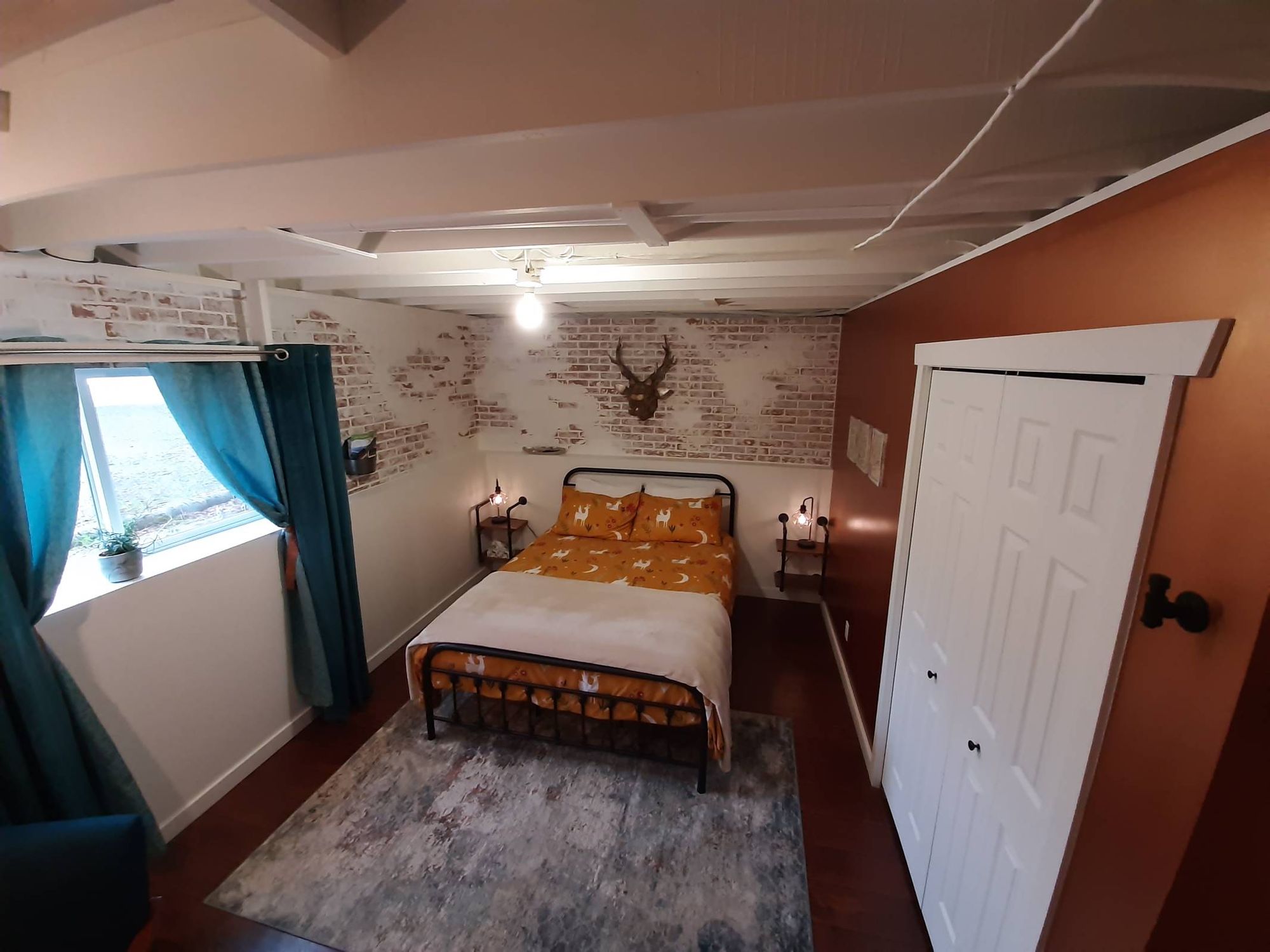 Achats : lampes de chevets x 2 (100$), tables de chevet en pipe d'acier/bois x 2 (200$), lampe bureau suspendue (30$), crochets (30$), fausse brique panneaux (270$), tête de cerf en carton (45$), tablettes de garde-robe x 2 (310 $), tapis (210$), peinture métallique cuivre (120$), structure de lit victorien (240$), articles décoration (135$), chaise de bureau (300 $)