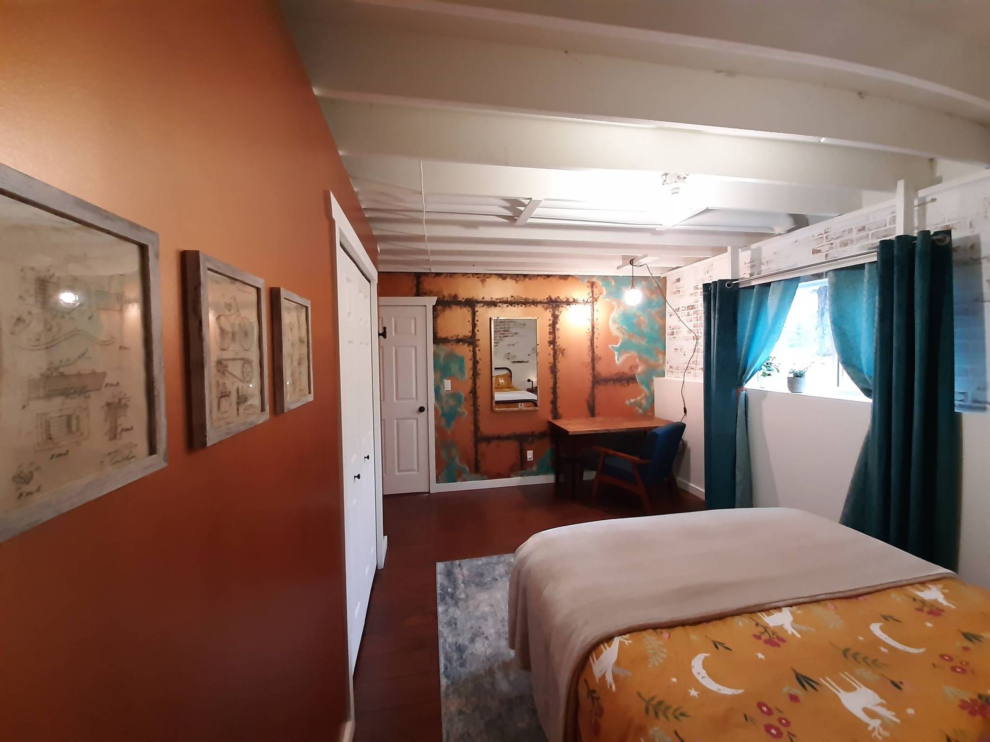 Objets réutilisés : matelas queen, rideaux x 2 ensembles et pôles, miroir, poignées de porte et pentures, peinture, housse de lit, couette, draps et oreillers, bureau et ses papattes