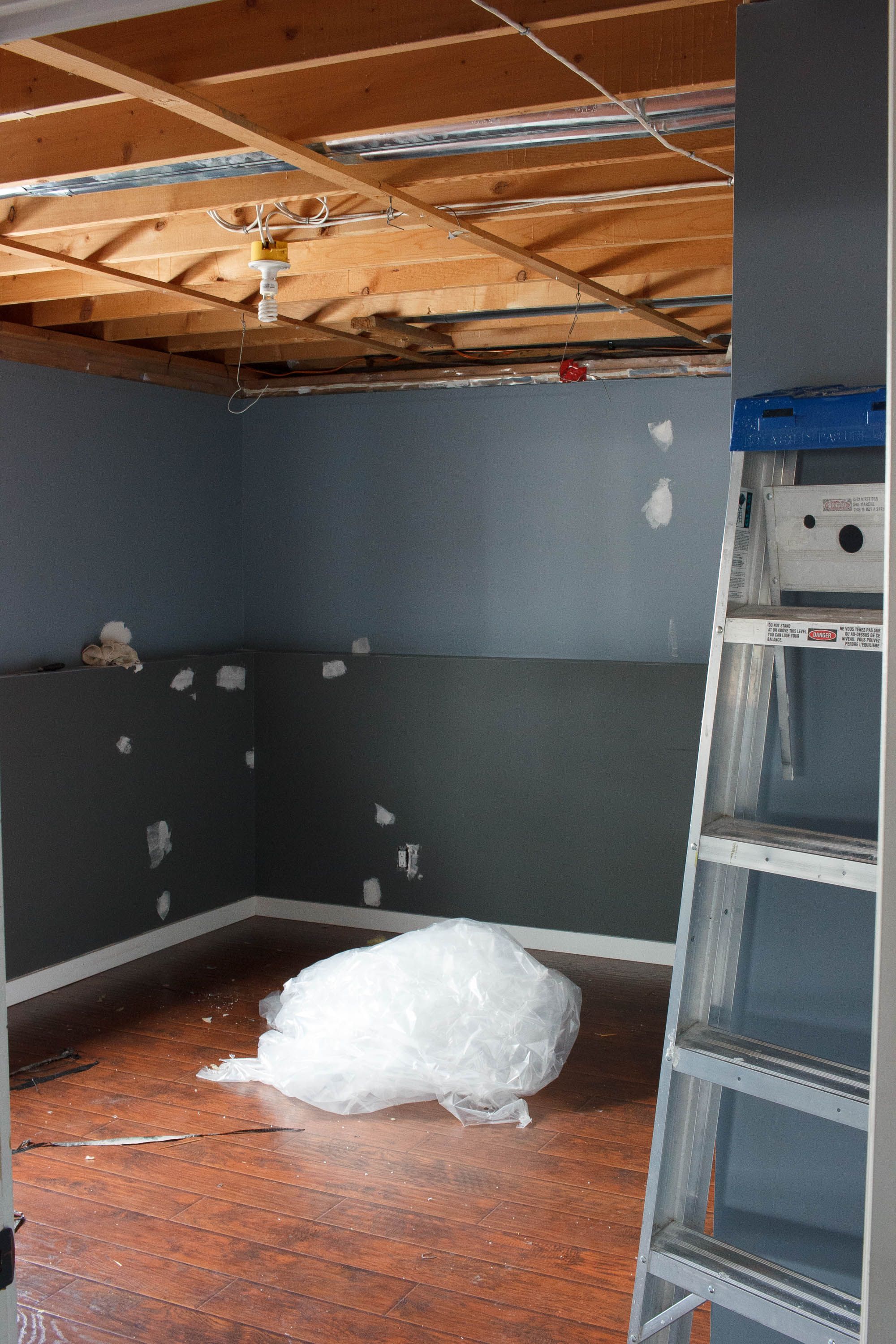 Le plafond en valait la peine mais pas certaine que j'aurais envie de recommencer... ça m'aura pris 2 séances de chiro pour me remettre du mal de cou, ha! C'était une grosse semaine de travail intense; retirer le strapping du plafond pour le remplacer par des petits supports pour les conduits d'aération, enlever toutes les vis, clous et autres cossins laids, nettoyer la poussière et les toiles d'araignées et finalement, une couche d'apprêt et ensuite, une couche de blanc.... beau, pas beau, I don't care, NO WAY que je fais une couche supplémentaire! We are soooo done you and me.