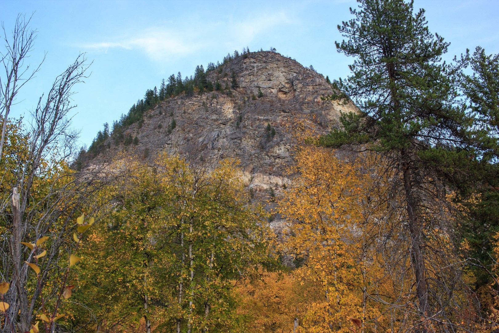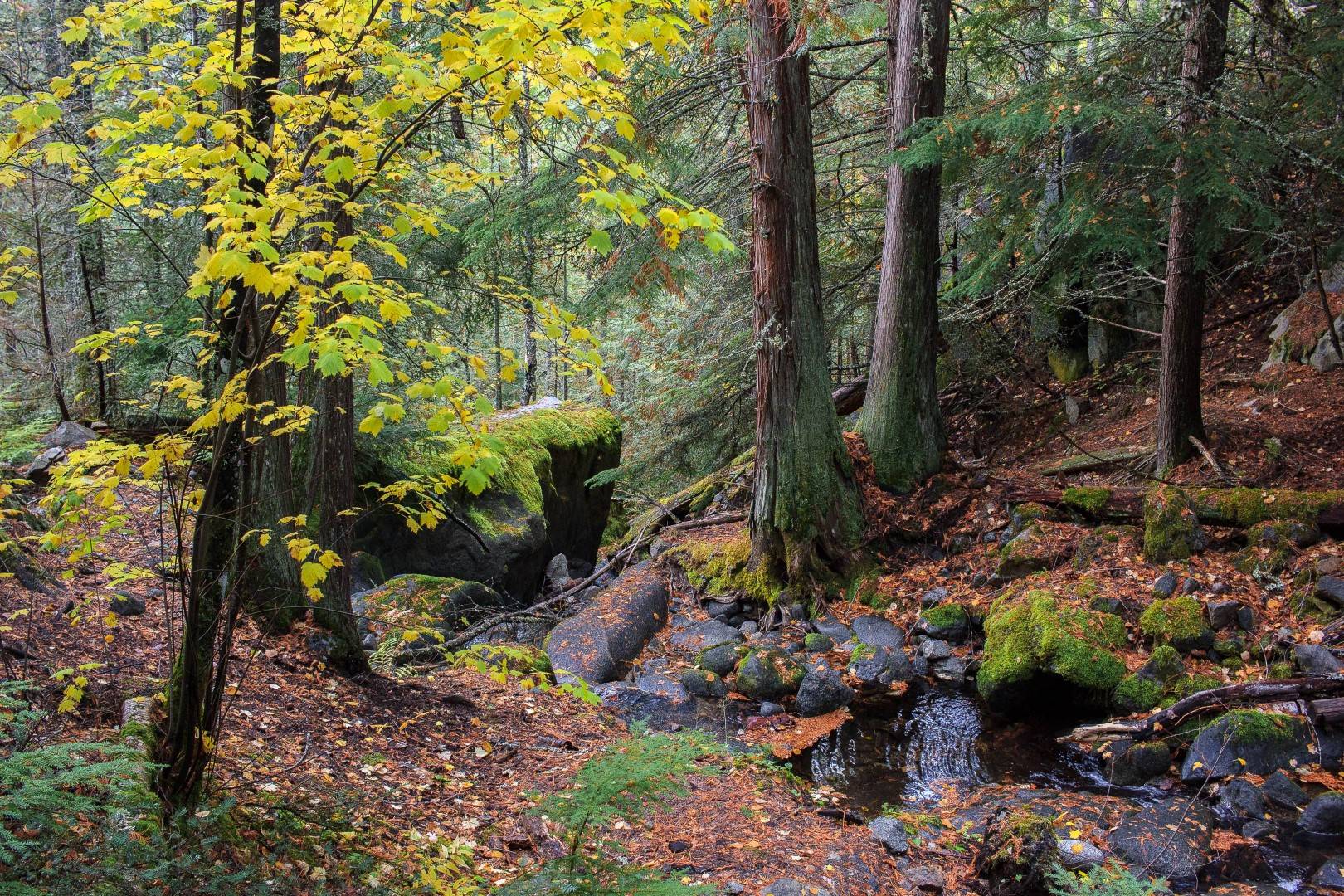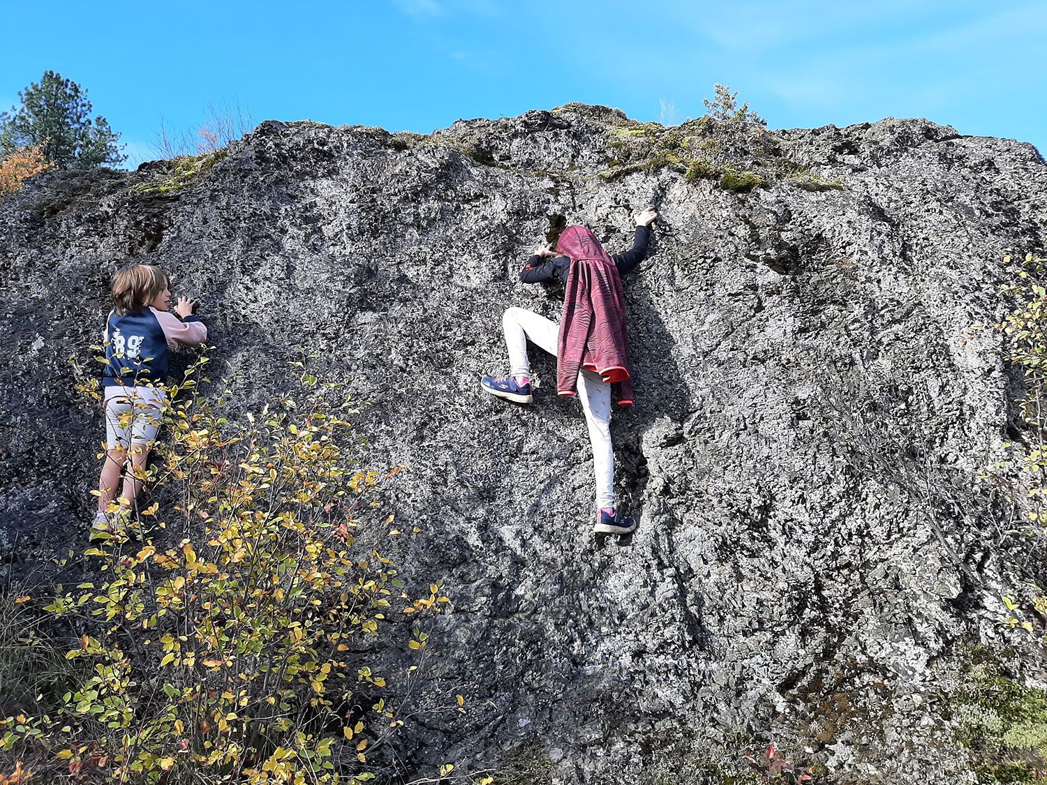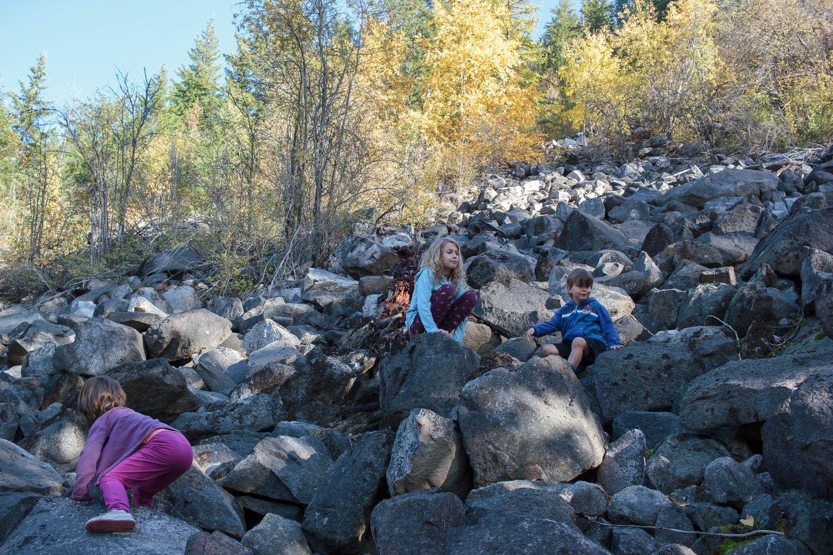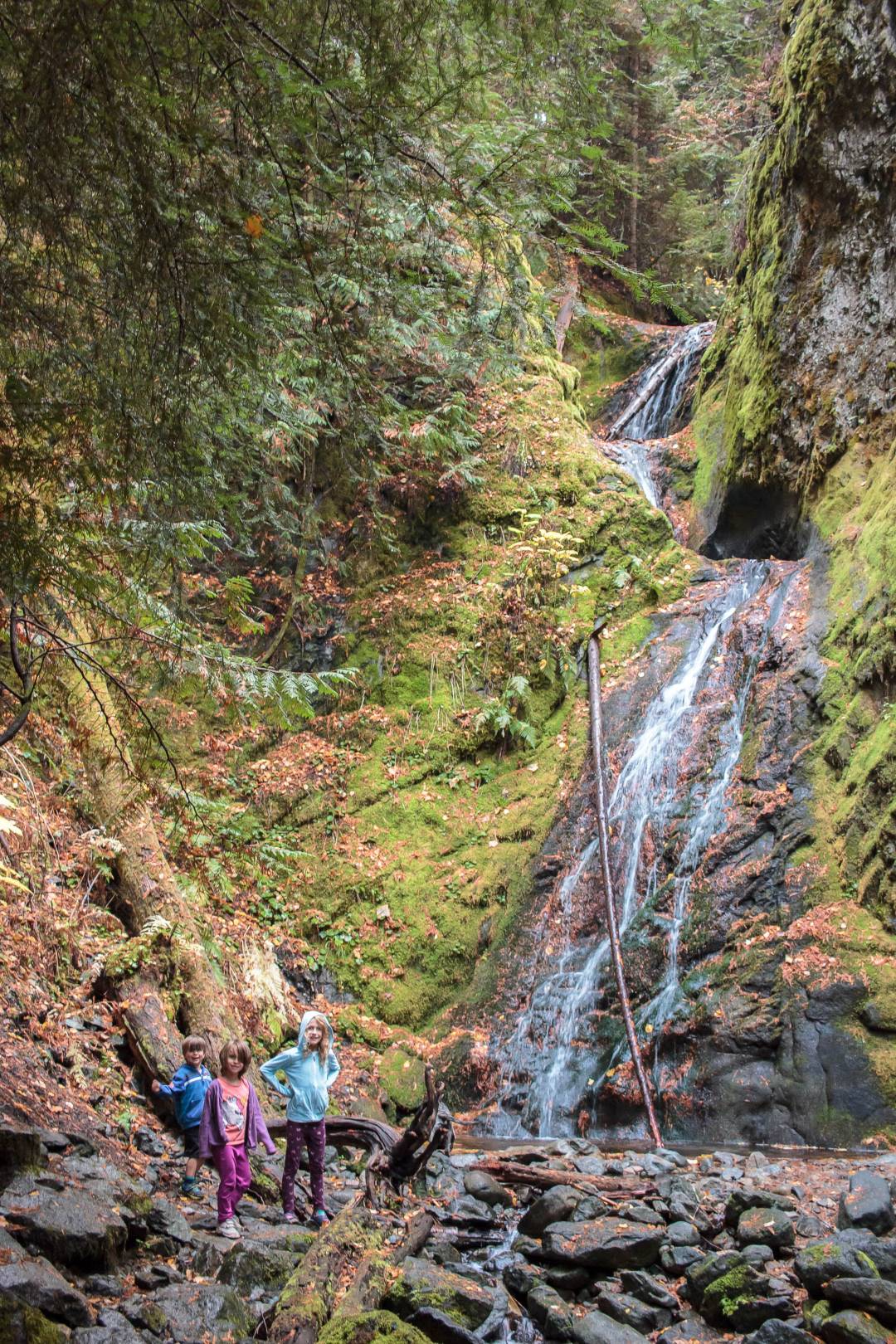 Samedi les enfants ont repris du poil de la bête alors on en a profité pour faire la rando que les enfants étaient sensés faire avec l'école le vendredi. 6km et moins d'élévation que d'habitude ce fut une rando plaisante au court de laquelle on a croisé des paysages très différents: route à flanc de falaise, dans une forêt de bouleaux aux couleurs magnifiques, une vieille forêt de sapins dont un très vieil arbre d'une hauteur de 115m apparemment. On a fini la rando à la sympathique chute de Little Mc Phee creek.