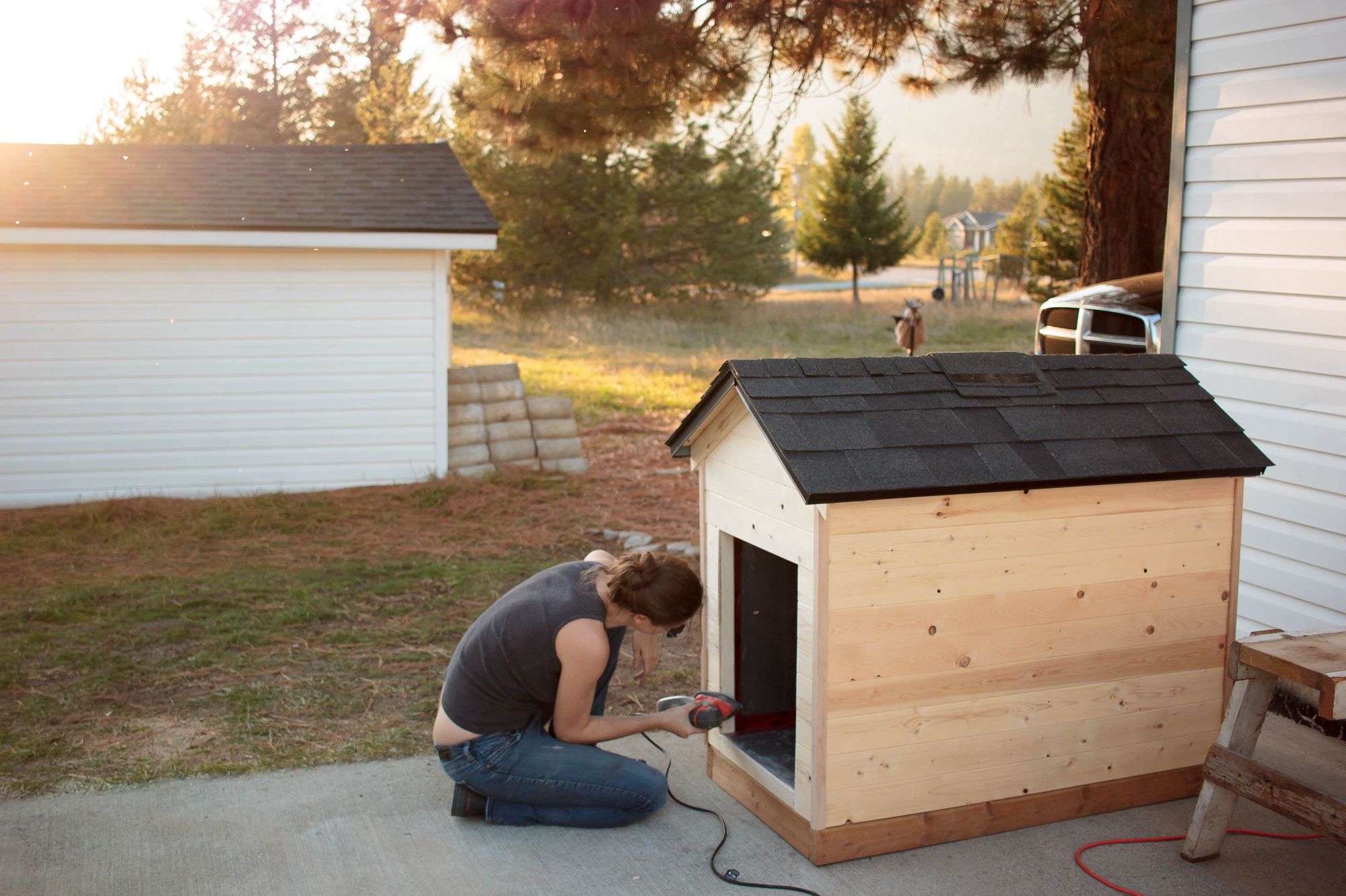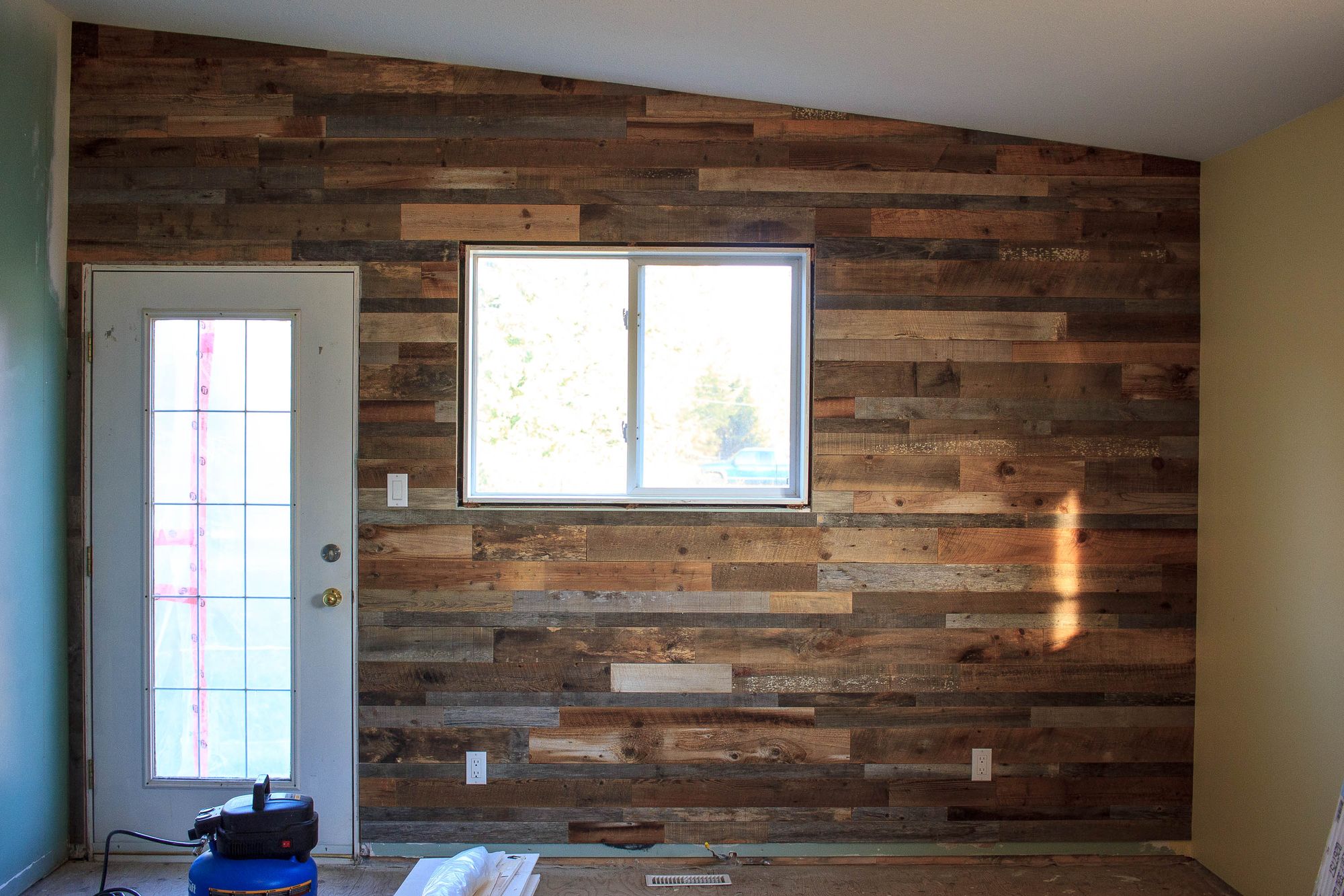 Kim a bien avancé dans les travaux, le mur de barn wood et la niche de Bea sont terminés, faut voir Kim manier le gun à clous et la scie circulaire, pas mal pro !