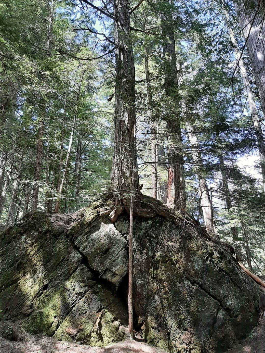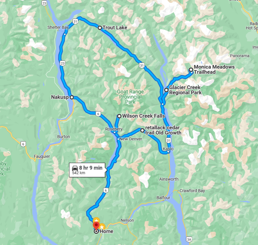 "Seulement" 550km, on pourrait se dire qu'il s'agit d'un petit voyage mais la moitié s'est fait sur de routes de terres aux conditions de conduite plus ou moins douteuses. Google, habituellement précis dans son estimé du temps de voyage s'est royalement planté ici, ça nous aura pris pas loin de 11h de route pour faire la boucle. Ce trajet s'est fait en 2 temps: l'aller ou nous nous sommes arrêtés à Wilson creek falls pour une petite rando, et sommes ensuite passé par Trout lake au nord pour s'arrêter au camping de Glacier creek, un coin recommandé par la prof d'Aylie et validé par 3-4 personnes. Au camping nous avions une journée rando prévue, puis pour le retour nous sommes passés par Kaslo, avec un arrêt pour visiter une vieille forêt de cèdres.