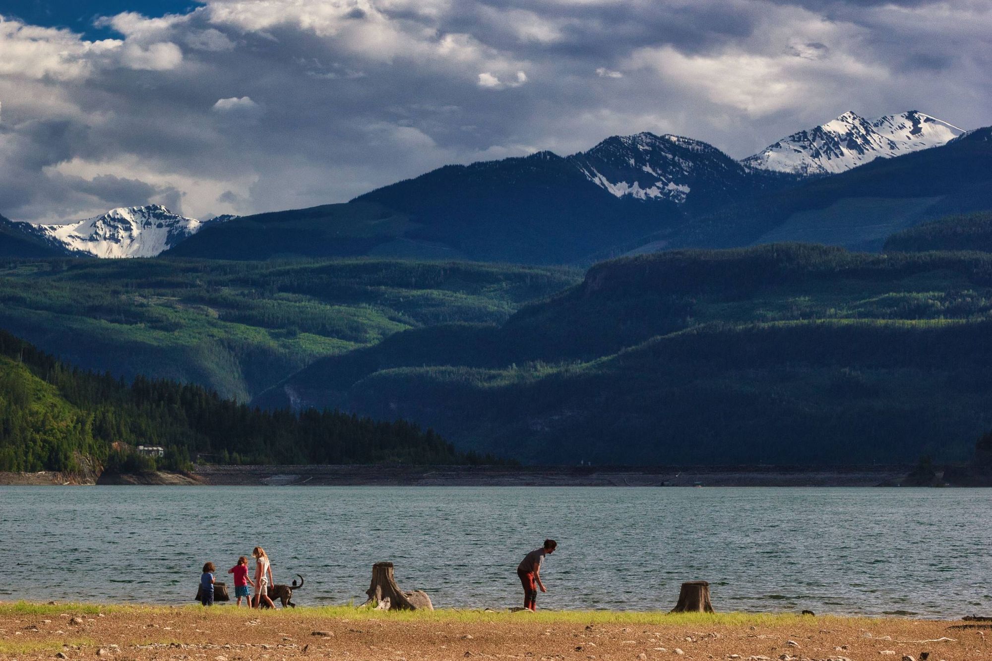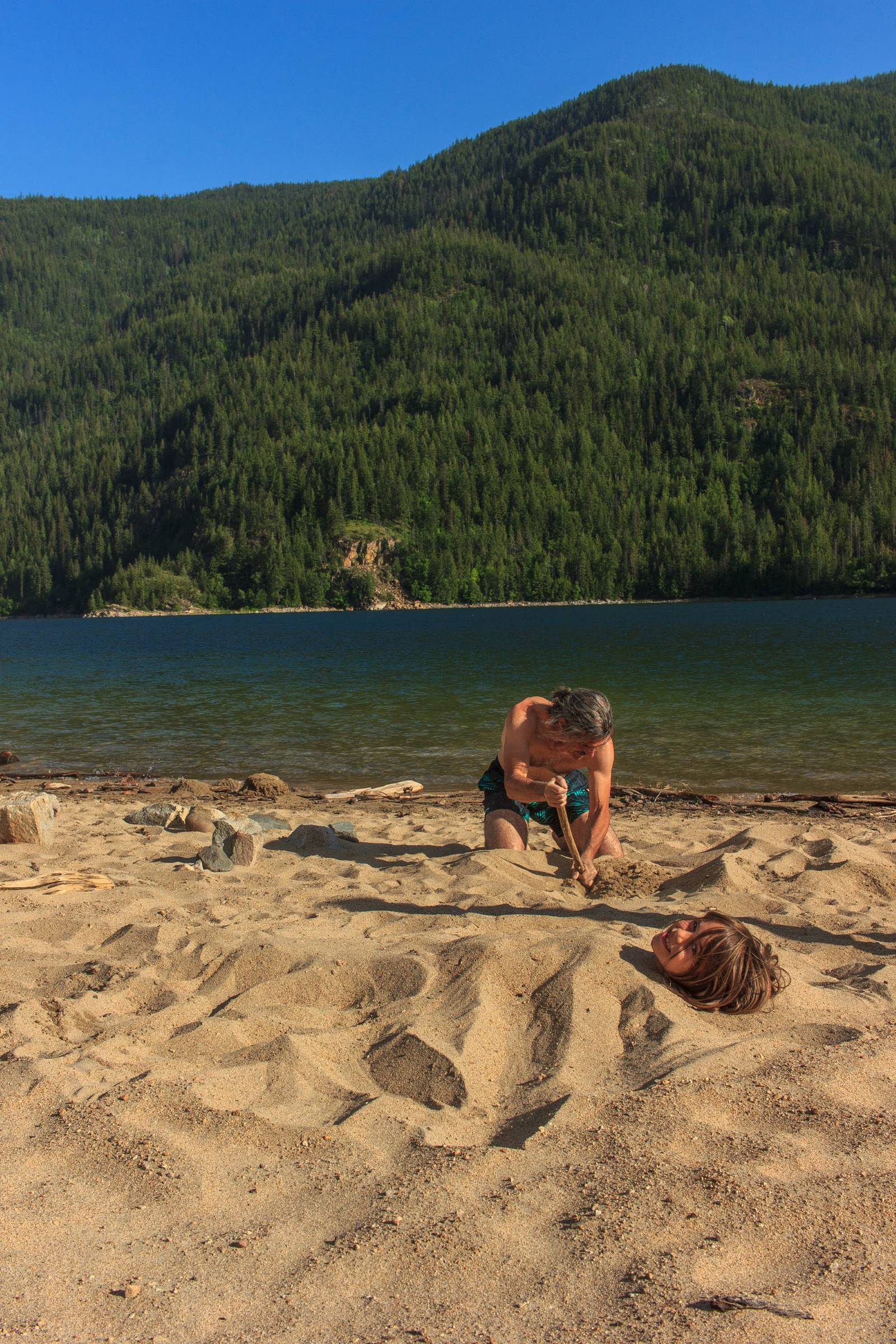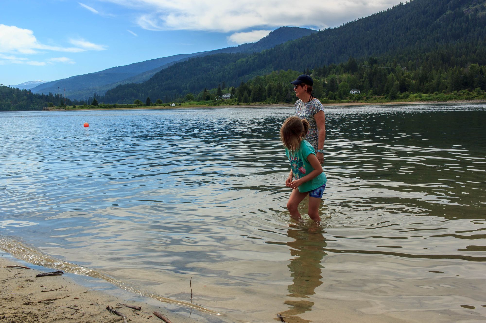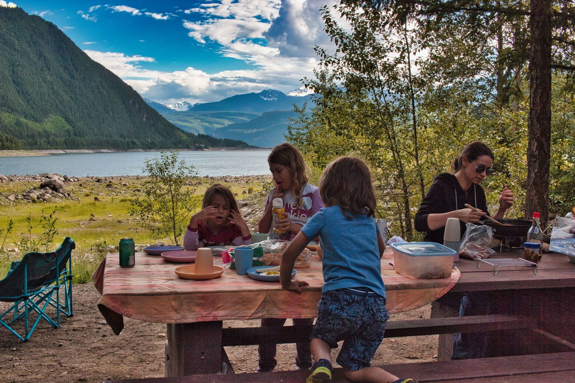 Arrivés à Trout lake, l'autoroute est passée d'asphalte à terre. En bien meilleure condition que le chemin de terre des chutes... Mais ça reste une conduite intense car il y avait beaucoup de virages, passages étroits et endroits glissants. J'ai été un peu déçu par la route, ce fut un long trajet dont la vue était principalement cachée par les arbres. Ceci dit, lorsque la vue se dégage, on peut découvrir ce magnifique lac aux couleurs azur, au pieds de montagnes géantes. Sûrement un coin magnifique pour aller camper ! J'ai voulu faire une pause au bout du lac, pensant avoir une vue sympa, mais à part une marmotte et de la verdure il n'y avait pas grand chose à voir. Kim a crû que c'était le camping, mais non, patience ! Ça en vaudra la peine ! Bref, un dernier stretch d'autoroute de terre qui paru durer une éternité et nous sommes finalement arrivés au camping. C'est un coin magnifique, 15$ la nuit (premier arrivé, premier servi) pour des installations bien meilleures que ce qu'on a connu au camping avec l'école, et une vue superbe sur le lac Duncan entouré de beaux sommets enneigés. Le lac (un réservoir artificiel) était à un niveau bas lors de notre arrivée, se remplissant tranquillement lors de nos 3 jours de visite. On aurait pu avoir l'eau bordant notre camping, mais ce n'était pas si mal car cet espace supplémentaire nous a permis d'avoir un grand terrain tranquille ou Béa pouvait s'adonner à ses activités préférées sans déranger les voisins. On était encore en saison de moustiques, donc le matin comme à la tombée de la nuit, ces insectes rodaient autour de nous pour espérer se faire un festin de notre chair. On a pas eu tant de piqûres que ça au final mais bon, faudrait qu'on revienne un jour en fin de saison pour mieux en profiter. Mes parents, mon frère et les enfants ont dormis dans la tente alors que Kim et moi avons installé un matelas dans le coffre de notre cmax. Béa a dormi dans le coffre du camion quand à elle, de la place pour tout le monde bien qu'un peu serrés dans notre petite voiture. Sorties plage, grillades sur le feu, promenades au coucher de soleil, ce fut une belle expérience. Kim a cuisiné comme une chef, on s'est régalés.