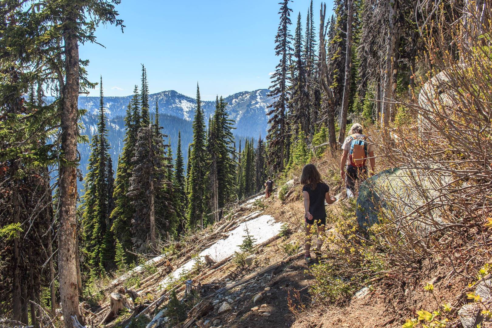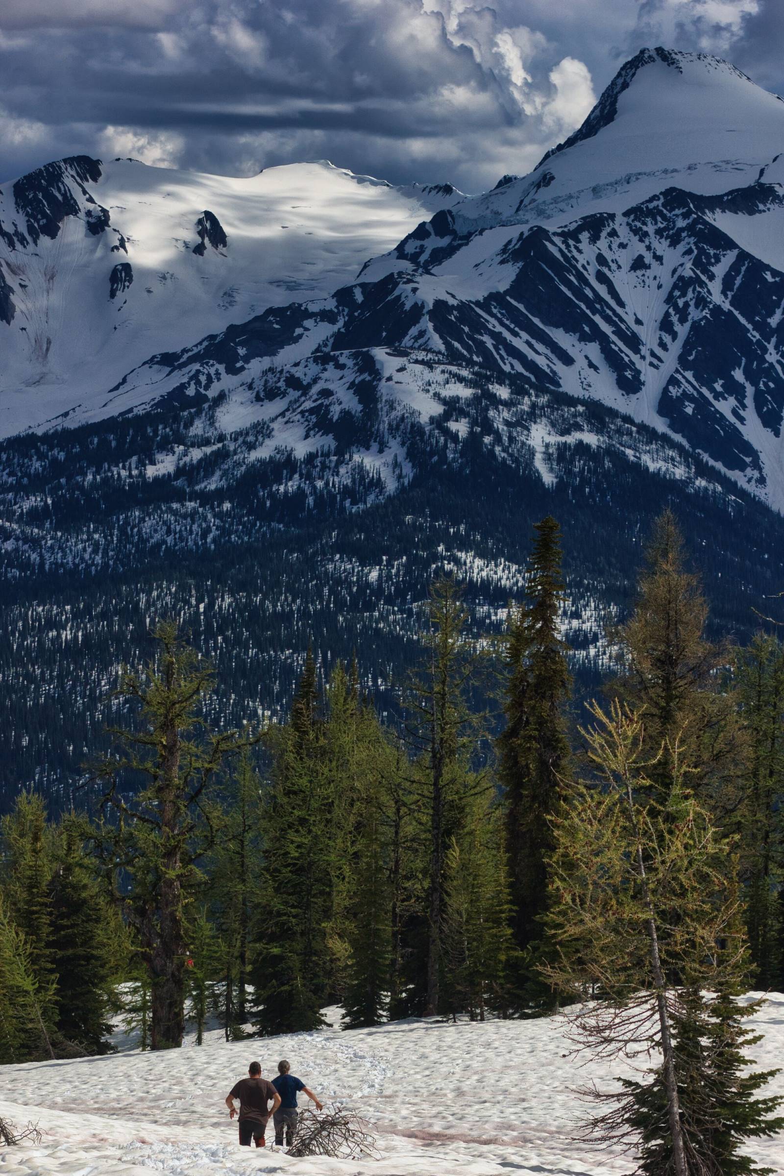 Après un peu de repos de notre précédente rando, nous avons tenté White Queen, une randonnée un cran plus difficile dans le coin de la station de ski de Nelson: White water. La piste commence en altitude (1600m) alors je me suis dit que pour une journée chaude ça serait un moment idéal pour chercher un peu de fraîcheur. On a eu un peu de mal à trouver le départ du sentier, n'ayant plus de connexion, mon téléphone n'avait plus la carte... Leçon apprise. Arrivés à une certaine altitude (~1900m) on a traversé quelques tas de neige, pour rapidement réaliser que l'exception allait devenir la norme: la dernière partie du trajet s'est faite dans la neige, malgré un temps très chaud. Expérience irréelle: marcher sur 2m de neige en short/t-shirt et faire des glissades sous un soleil de plomb. Aylie a été un peu découragée par le restant de marche pour se rendre au sommet de White Queen alors nous avons décider de nous arrêter sur la crête. Aucuns regrets car la vue était époustouflante et panoramique sur 2 cirques aux aspects très différents.
