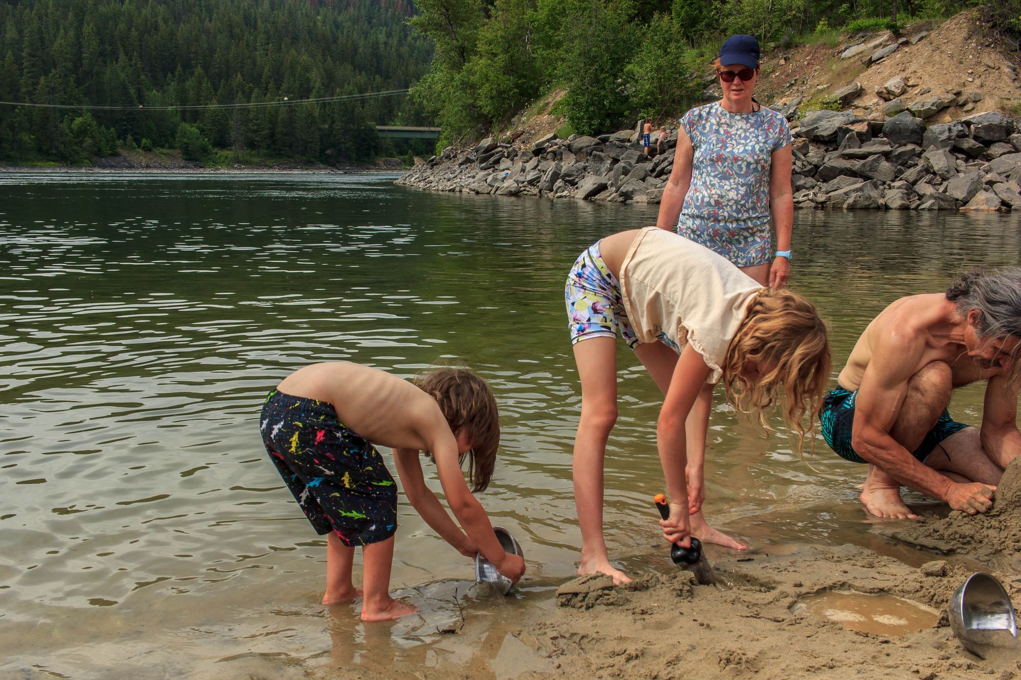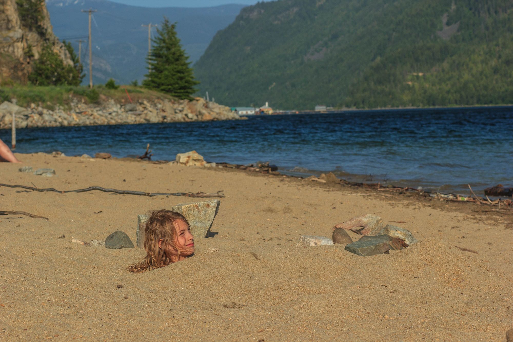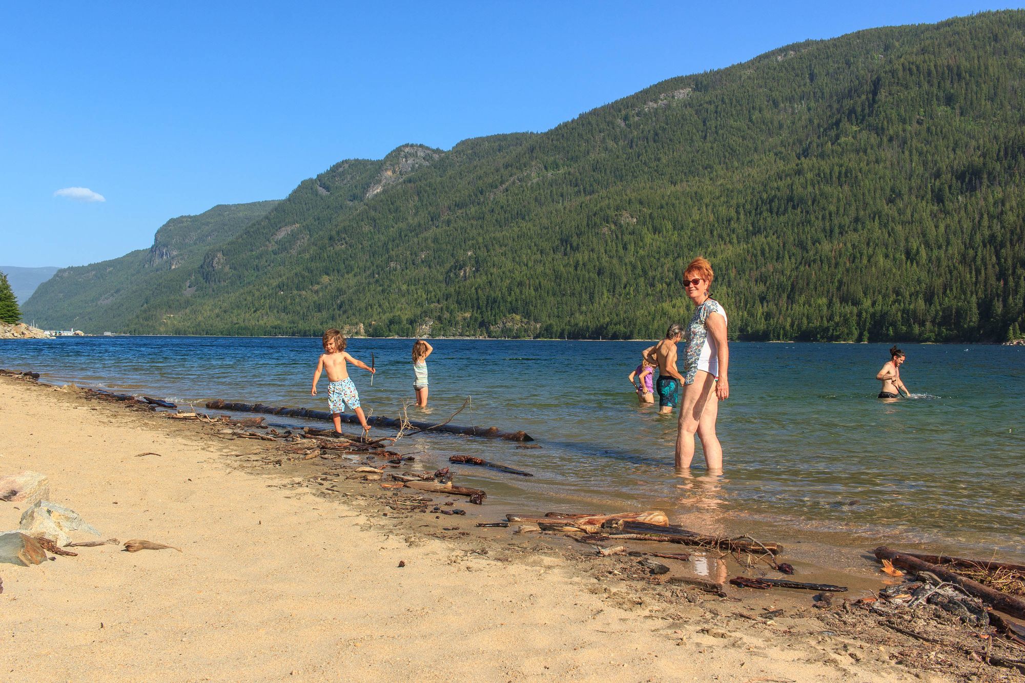 Après la neige, la plage ! Direction Taghum, proche de Nelson, pour une plage publique très populaire, probablement le plus de monde qu'on ait vu lors de nos activités ! Les enfants ont sympathisé avec des jeunes ayant du matériel de plage: petit canoë, bouées,... Alors Aylie s'est retrouvée à pagayer le canoë en tirant un petit train de bouées. Châteaux de sable et autres activités de plage... L'eau était trop fraîche pour s'y baigner mais ce fut une belle journée !