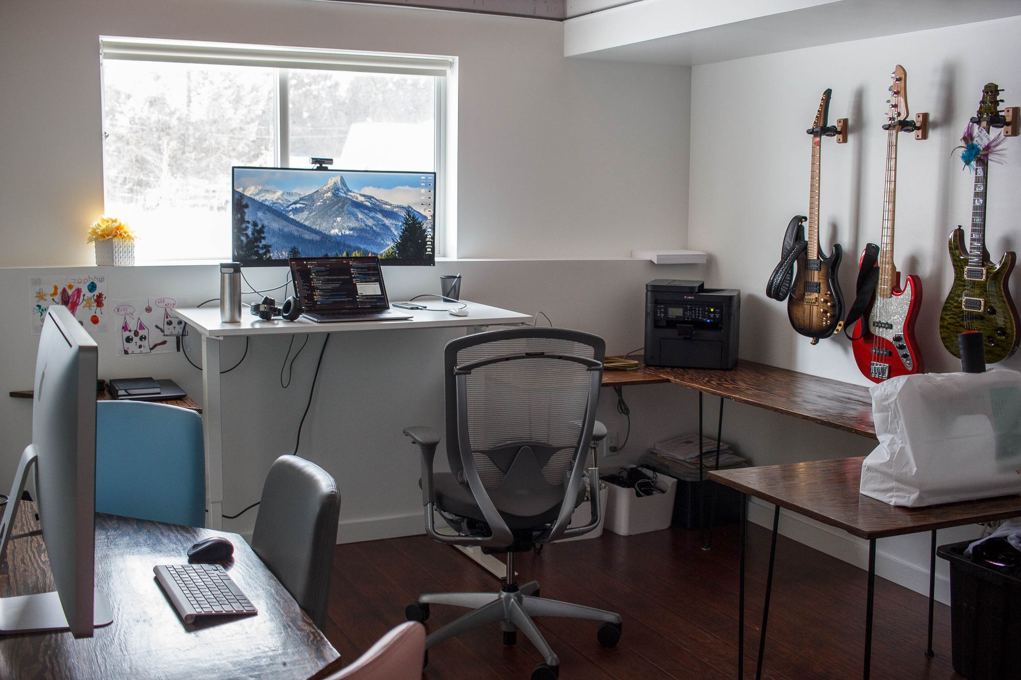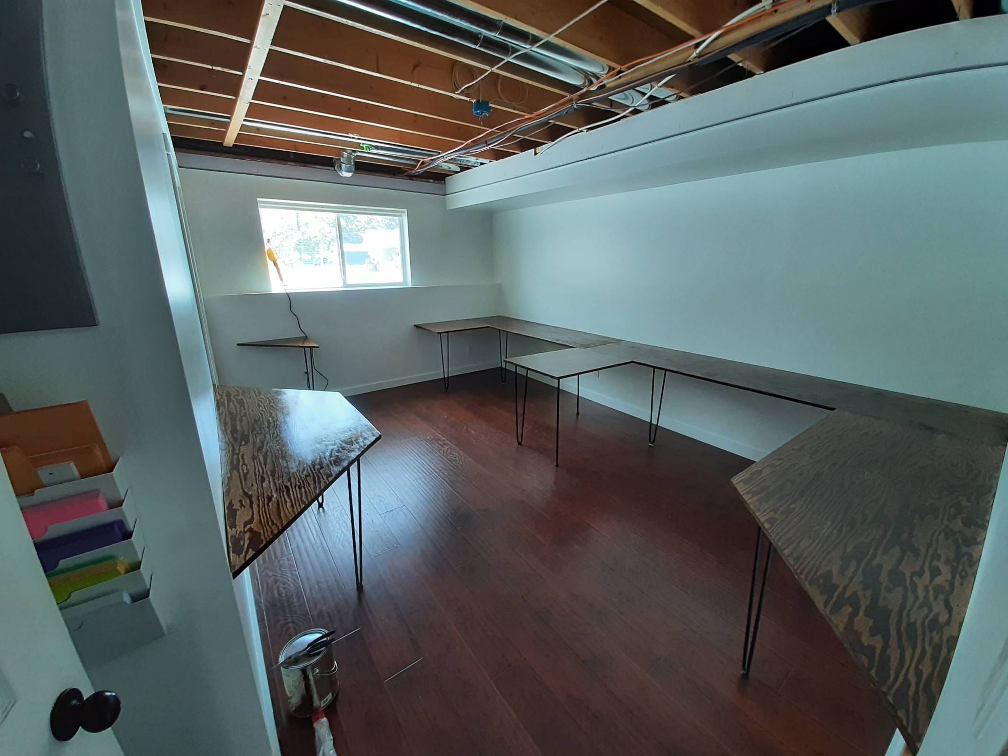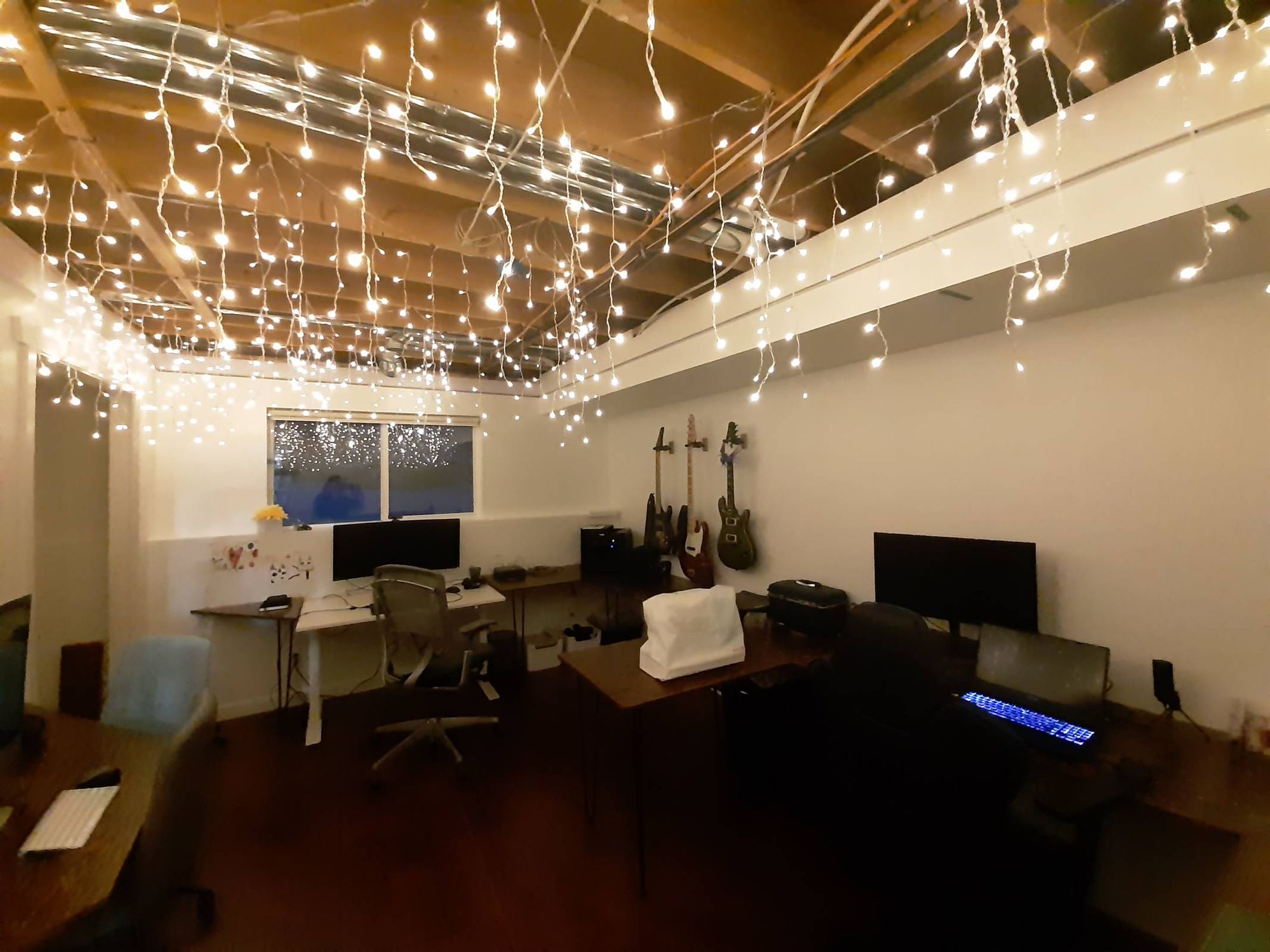 Kim a quasiment fini le bureau, On y a emménagé et fait de la pièce à côté notre nouvelle chambre temporaire. On se plaît dans ce nouvel espace, surtout depuis qu'on a fait réparer le foyer dans la pièce d'a côté, qu'on l'utilise pour nos feux de soirée et que Kim a installé des petites LED au plafond ! Un bureau sur mesure, découpé, teint et verni par Kiki, merci namour ! Ça fait du bien de retrouver ce confort.